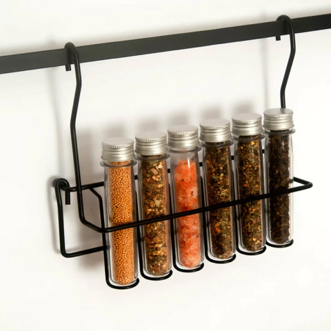 PORTA TEMPEROS COM 06 TUBOS PET COM TRAVA DE APOIO Medidas: 260x235x75mm Características: com trava para apoio em bancada compatível Material: aço carbono Acabamento: pintura preta